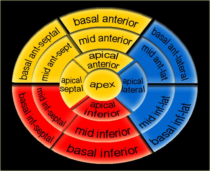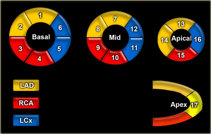 Các vùng cơ tim có bất thường về ngấm thuốc hoặc rối loạn vận động thành tim được đặt tên và xác định vị trí theo mô hình 17 vùng của Hiệp hội Tim mạch Hoa Kỳ (37).