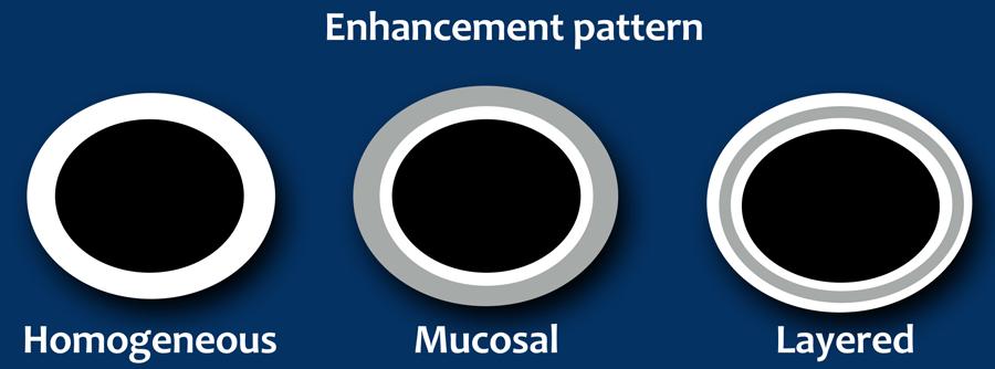 Biểu hiện là thành ruột dày với lớp niêm mạc ngấm thuốc tăng so với các lớp bên ngoài.