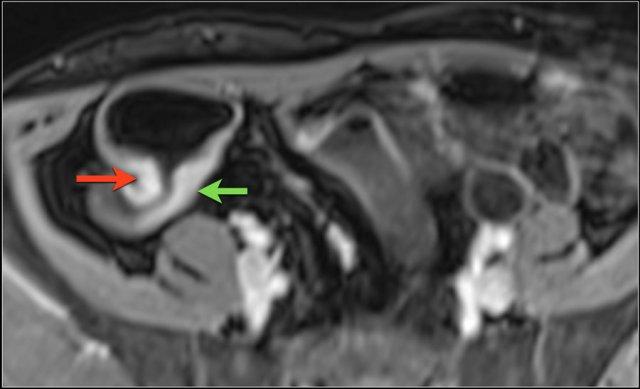 Kiểu ngấm thuốc phân lớp tại trực tràng kèm một ít mờ mỡ xung quanh trên hình ảnh T1 axial sau tiêm thuốc tương phản từ (mũi tên). Tình trạng viêm liên tục với kiểu ngấm thuốc đồng nhất có thể thấy tại đại tràng sigma (mũi tên xanh lá). Ngoài ra, có một nang phần phụ bên phải với viền ngấm thuốc (đầu mũi tên).