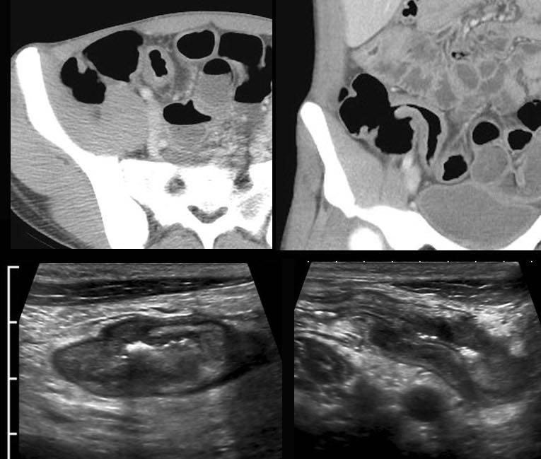 Hồi tràng tận đang viêm hoạt động với một vùng giảm âm có ranh giới vừa phải nằm ngoài thành ruột, được bao quanh bởi mô mỡ viêm, cho thấy sự hình thành đường xoang và áp xe.