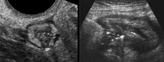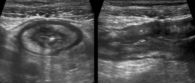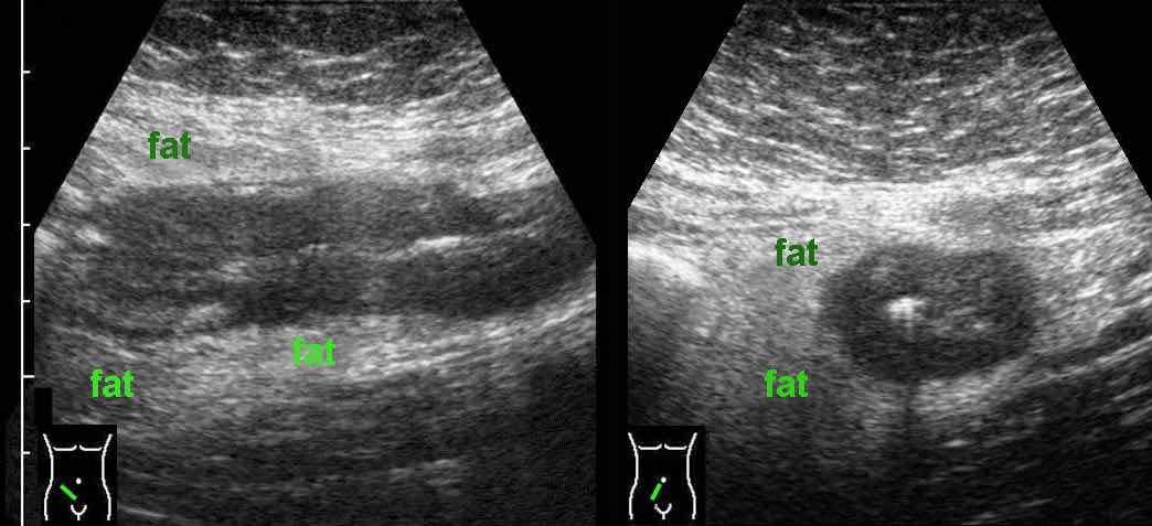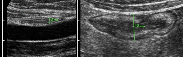 Đo độ dày thành ruột được thực hiện tốt nhất và có tính tái lập cao nhất trong khi ép, như ở đây trên một người bình thường (bên trái) và ở một bệnh nhân mắc bệnh Crohn (bên phải).