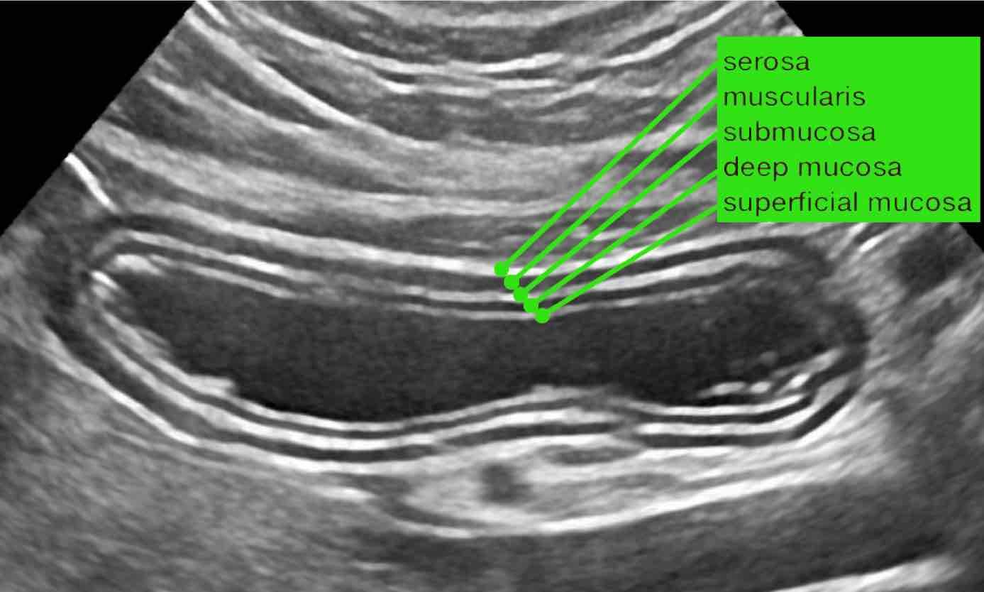 Cấu trúc siêu âm của thành ruột bình thường có hình thái đặc trưng gồm năm lớp với độ hồi âm xen kẽ nhau, tương ứng chặt chẽ với các lớp mô học của thành ruột.