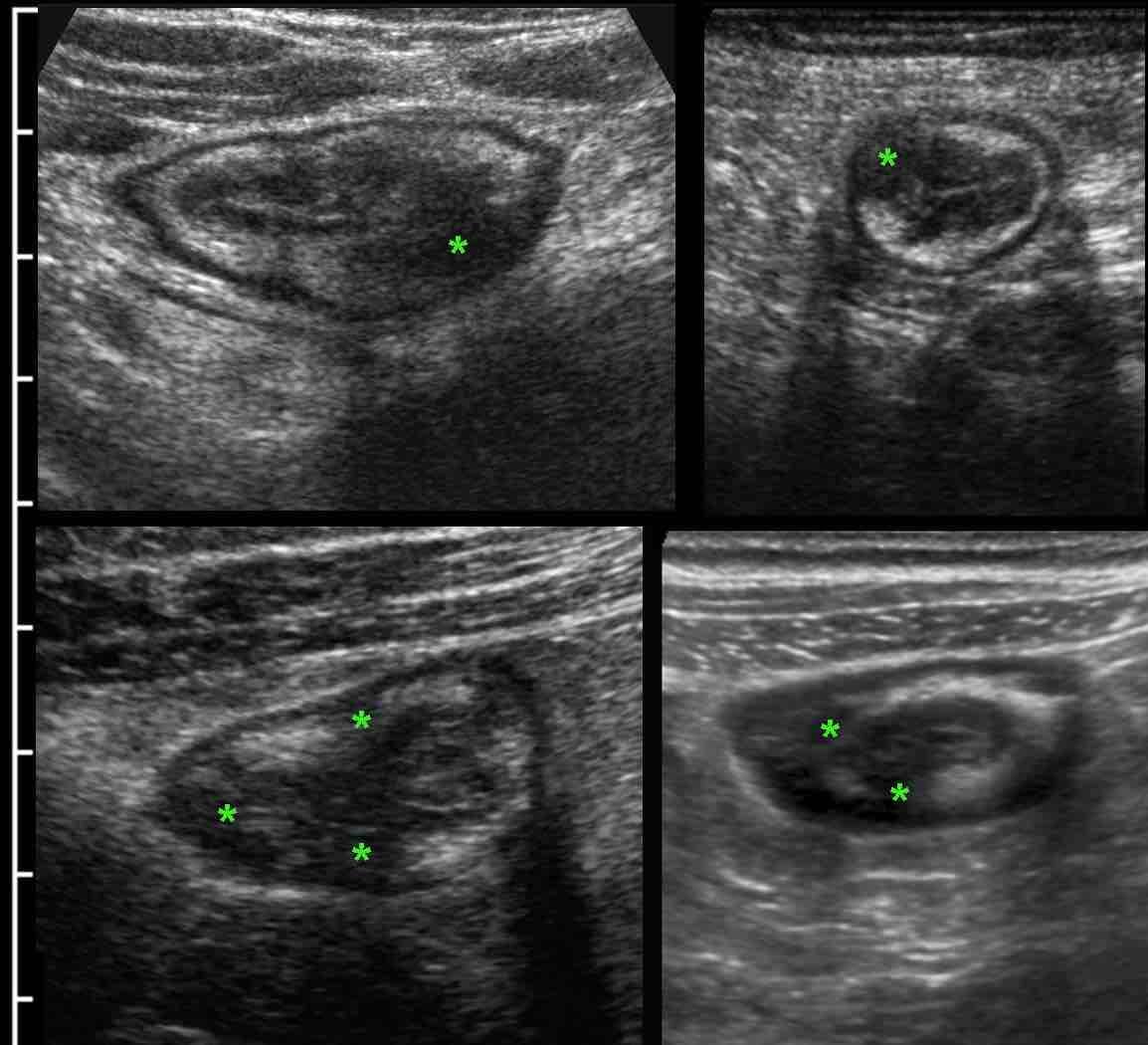 Sự tiến triển xuyên thành này được nhận biết là các thay đổi giảm âm (*) khu trú trong lớp dưới niêm mạc vốn tăng âm, tương quan chặt chẽ với các phát hiện nội soi và các thay đổi mô học viêm hoạt động (4).