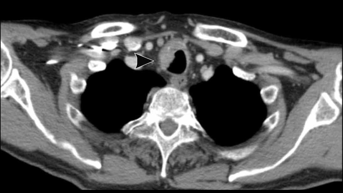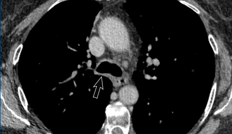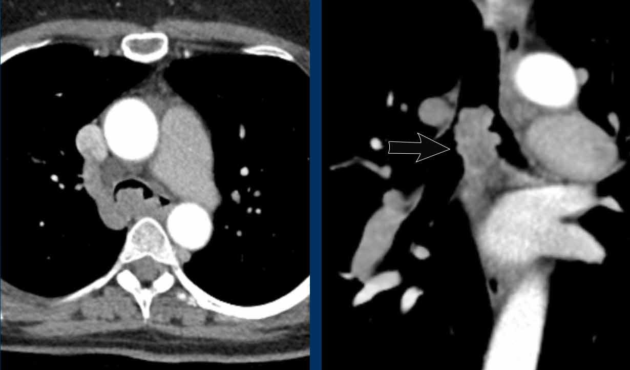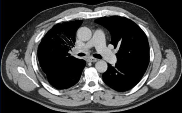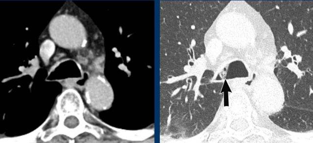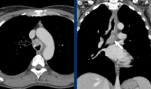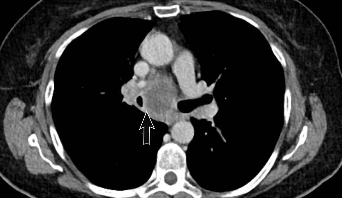 Viêm trung thất xơ hóa bên phải ở nam giới 51 tuổi, cho thấy tổn thương tỷ trọng mô mềm xung quanh phế quản chính phải (mũi tên).