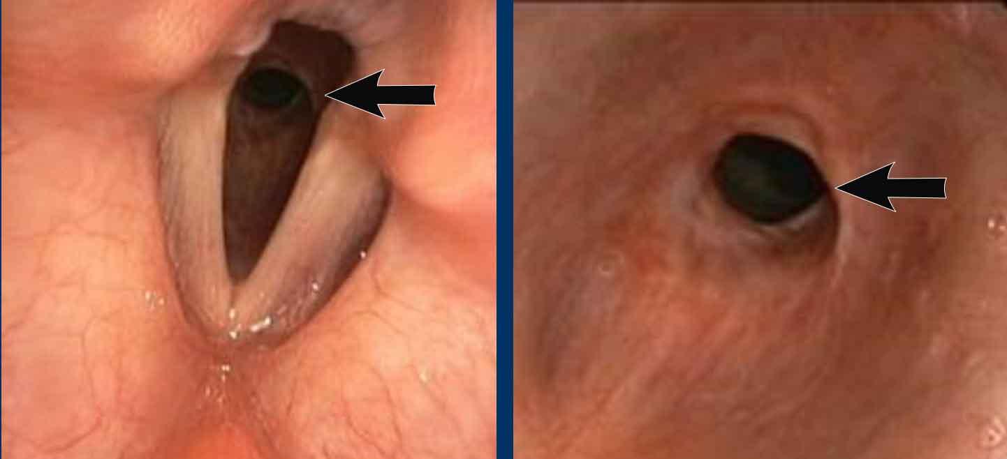 Hình ảnh nội soi phế quản từ phía trên và phía dưới mức dây thanh âm cho thấy hẹp hạ thanh môn đáng kể của khí quản.