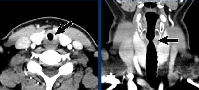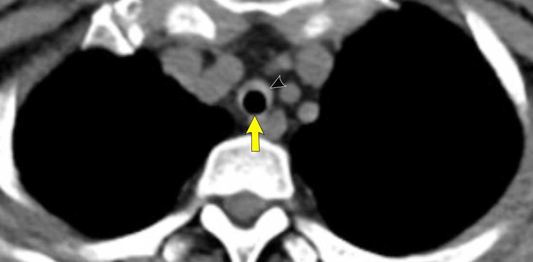 Điển hình là hình ảnh hẹp hạ thanh môn gần lỗ vào lồng ngực, có dạng hình đồng hồ cát trên mặt phẳng coronal, do đoạn sẹo xơ ngắn khu trú tại khí quản (hình minh họa).