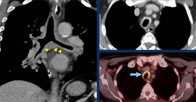 Dày thành lan tỏa toàn chu vi của khí quản và các phế quản trung tâm kèm tăng hấp thu trên xạ hình FDG-PET (mũi tên xanh) ở bệnh nhân nam 72 tuổi sau mở khí quản do biến chứng phẫu thuật cắt tuyến giáp.