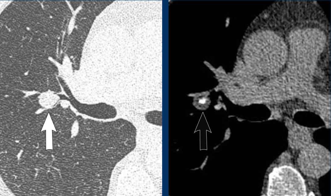 Trên hình ảnh CT, bệnh có thể có hình ảnh chồng lấp đáng kể với tổn thương đường thở do ác tính phổi trung tâm.