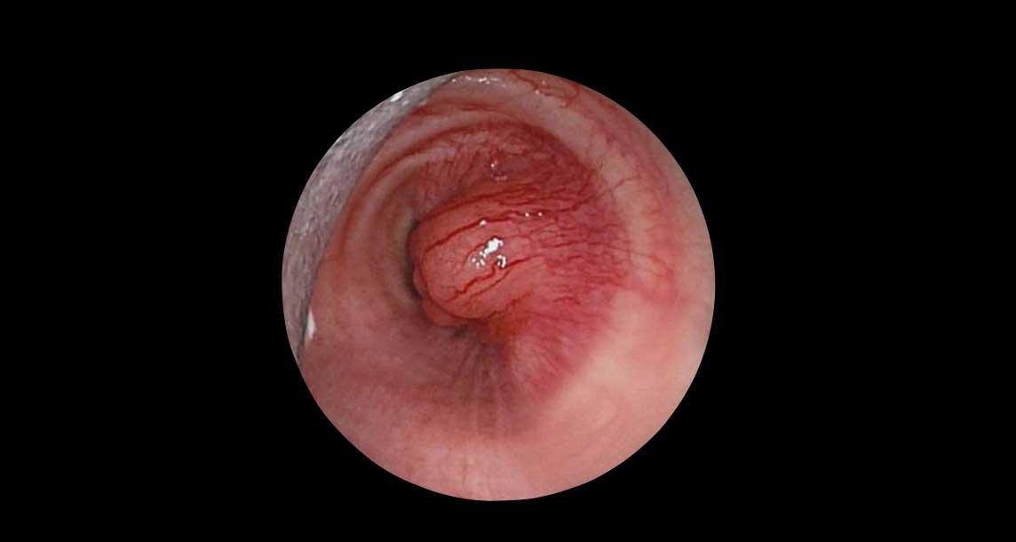 Bệnh u nhú khí-phế quản có tổn thương phổi ở bệnh nhân nam 54 tuổi, cho thấy hai u nhú trong lòng khí quản.