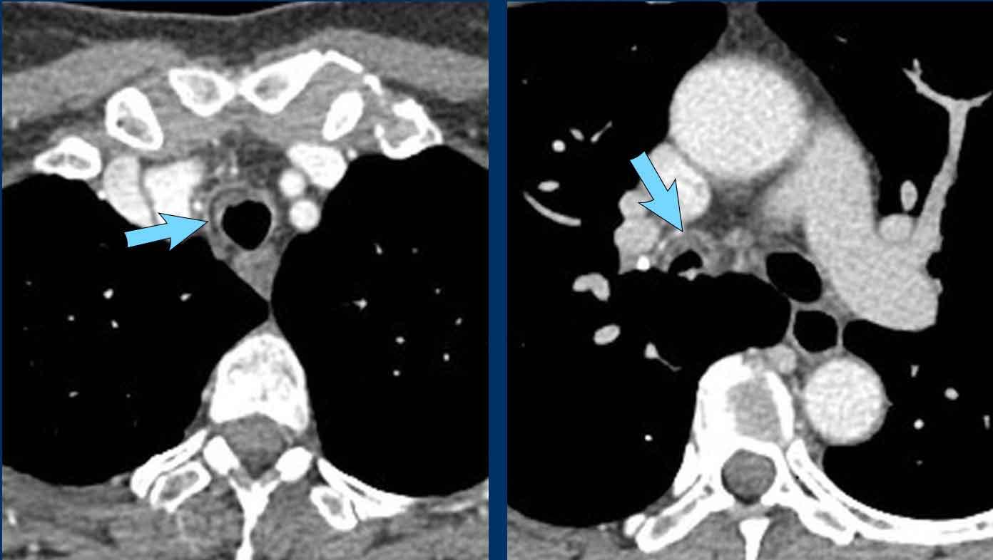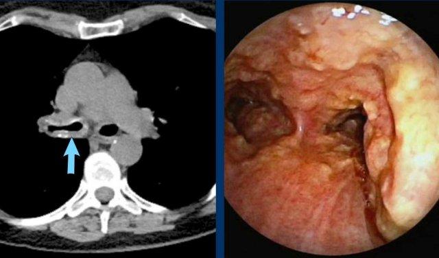 Khi khí quản và phế quản gốc bị ảnh hưởng, hình ảnh CT có thể cho thấy dày thành theo chu vi không đặc hiệu, hẹp lòng và các phát hiện sau tắc nghẽn.