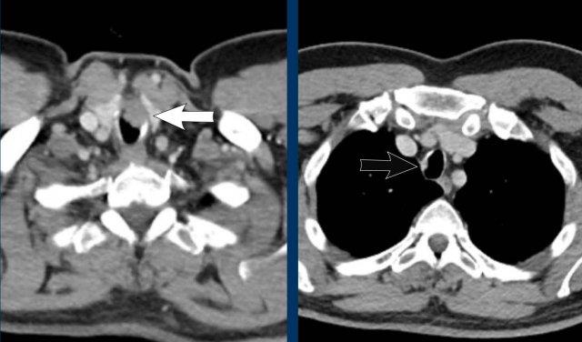 Phế quản khí quản tình cờ phát hiện ở nam giới 28 tuổi được chụp CT theo dõi ung thư (hình ảnh mặt cắt ngang) và ở nam giới 77 tuổi được chụp CT trong bối cảnh chấn thương (hình ảnh mặt cắt vành).