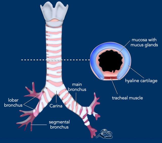 Lớp lót bên trong của đường thở bao gồm biểu mô hô hấp có lông chuyển xen kẽ với các tế bào hình đài, tuyến nước bọt nhỏ và các tế bào thần kinh nội tiết.