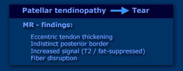 Tương tự như gân cơ tứ đầu đùi hay bất kỳ gân nào khác, MRI cho thấy một phổ hình ảnh từ dày gân lệch tâm, bờ sau không rõ nét, tăng tín hiệu trên ảnh chuỗi xung T2W và cuối cùng là đứt các bó sợi gân.