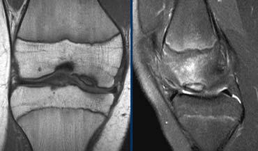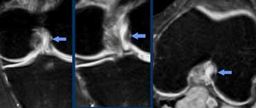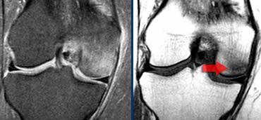 Trên MRI, hình ảnh trông giống như Jumper’s Knee ở trên. Chỉ trên ảnh mặt phẳng đứng ngang mới thấy được đường gãy giảm tín hiệu nằm trong phần sụn tăng tín hiệu.