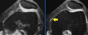 Rách hoàn toàn gân bánh chè. Ảnh bên phải cho thấy viêm túi hoạt dịch xuất huyết (giảm tín hiệu trong túi hoạt dịch).