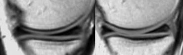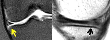 Sau một chấn thương mới, ảnh PD cho thấy tín hiệu cao rõ ràng chạm đến bề mặt sụn chêm (thấy rõ trên phim gốc, nhưng không thấy rõ trên ảnh đã nén bên trái).