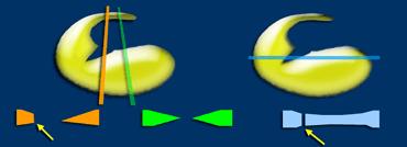 TRÁI: sụn chêm có hình dạng bất thường và có mảnh di lệch. PHẢI: Ba cấu trúc trong hố liên lồi cầu: dây chằng chéo sau (1), dây chằng chéo trước (2) và mảnh di lệch (3).