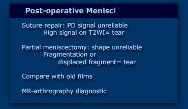 Tín hiệu bất thường không còn là dấu hiệu đáng tin cậy của rách sụn chêm, vì nếu đã được khâu phục hồi, vùng này sẽ lành với mô sẹo, mô sẹo cũng có tín hiệu cao trên ảnh PD (hình minh họa).