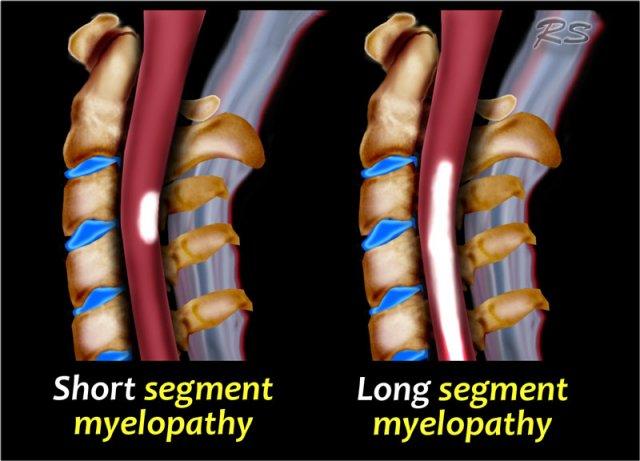 Trong MS, tổn thương thường ngắn đoạn, tức là dưới 2 đốt sống.