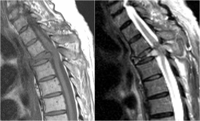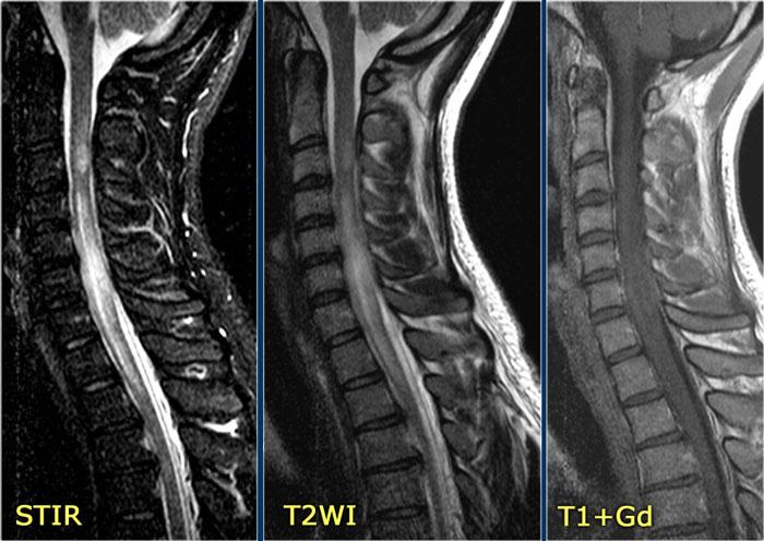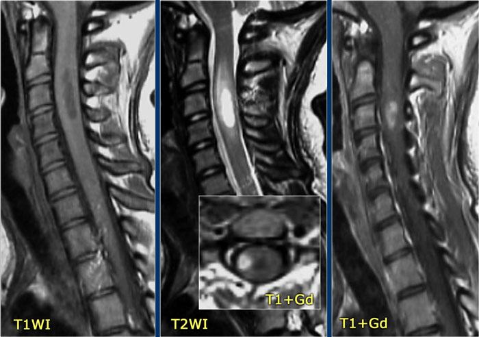 Đây là hình ảnh của bệnh nhân nam 31 tuổi với các triệu chứng đau đầu, rối loạn đi tiểu, bí tiểu, mức cảm giác tại C3.