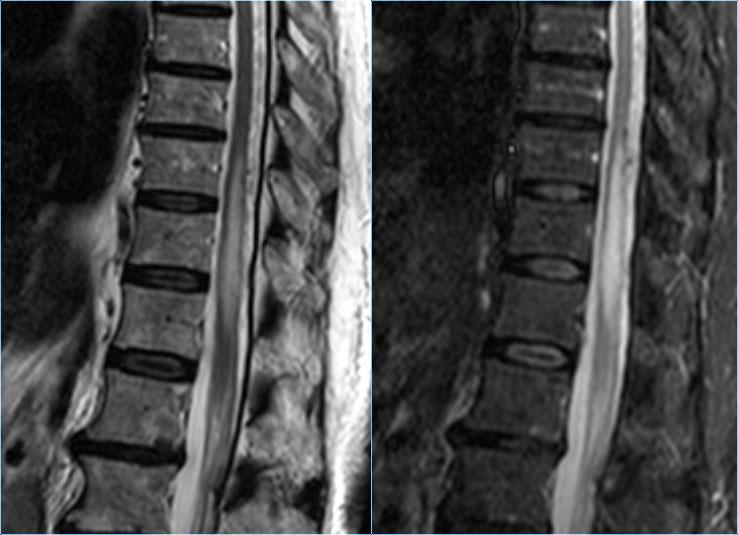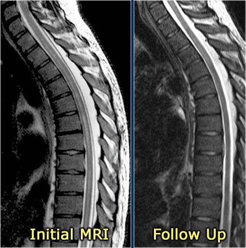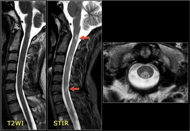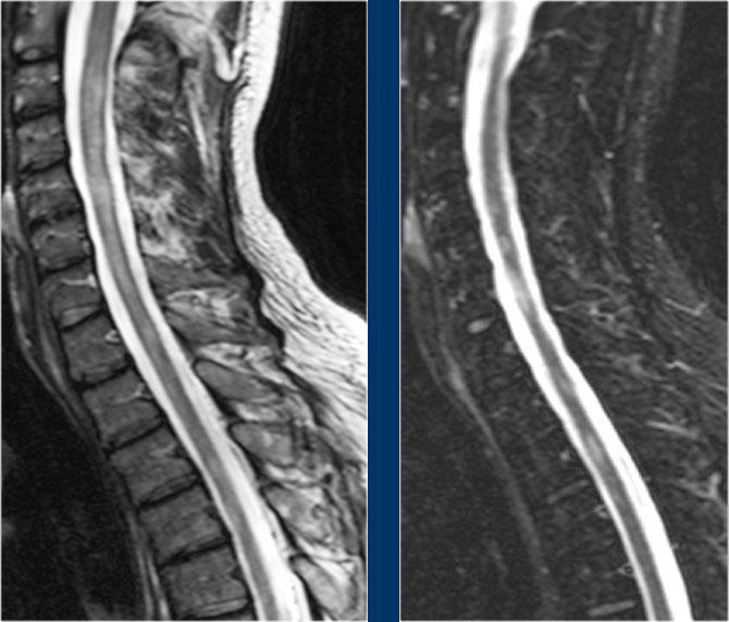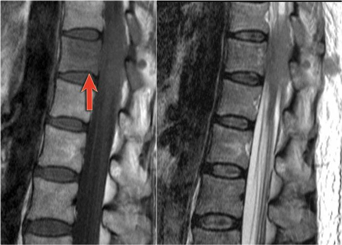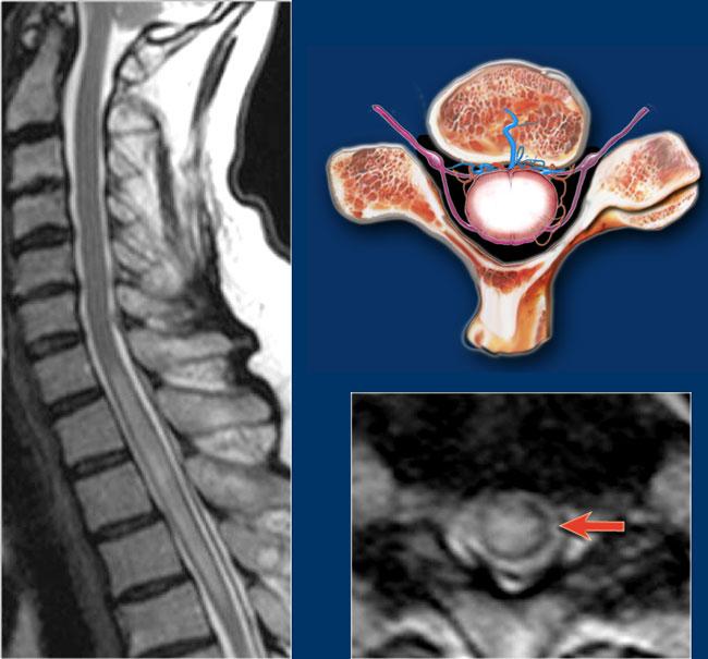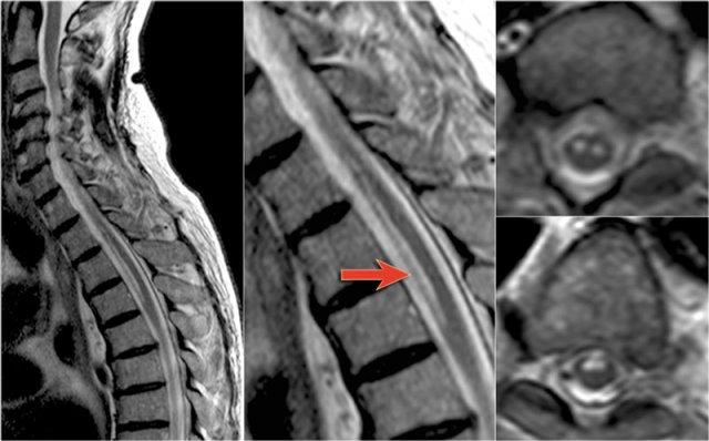 Sử dụng hình ảnh mặt cắt ngang độ phân giải cao để xác định vị trí tổn thương trong tủy. Tổn thương ở phía sau như trong MS, thiếu hụt vitamin B12; ở phía bên như trong MS; hay ở phía trước như trong nhồi máu động mạch. - Tủy sống có phù nề không?
