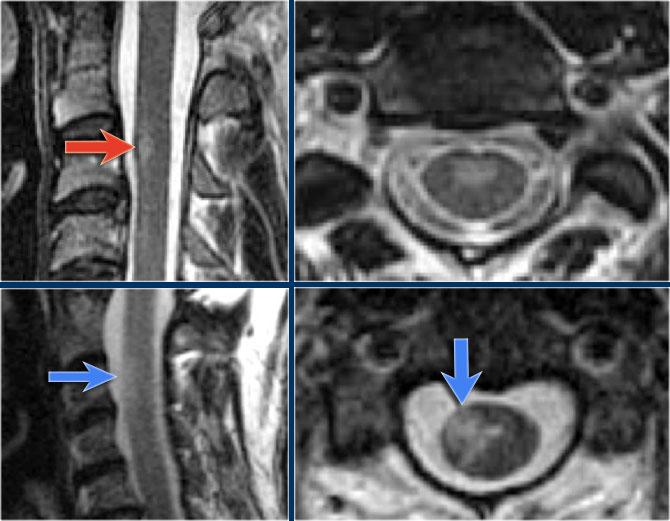 MS là bệnh “bắt chước vĩ đại” và cũng có thể nằm ở phía trước như ở bệnh nhân này, người có tổn thương ở vị trí điển hình (mũi tên xanh) nhưng cũng có tổn thương ở phía bụng của tủy (mũi tên đỏ).