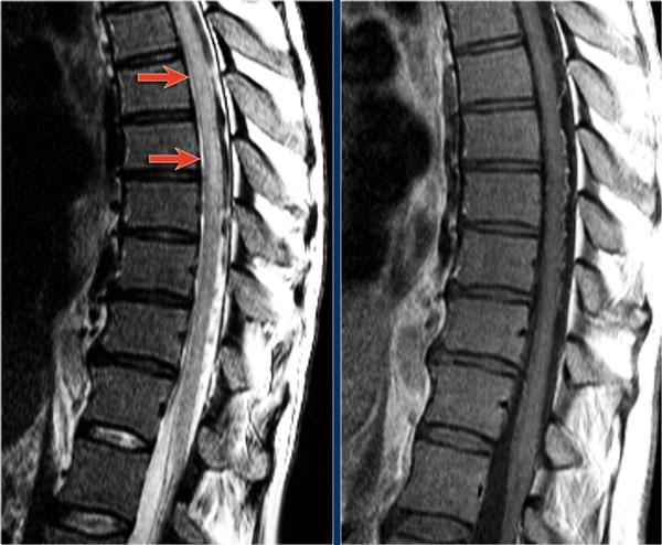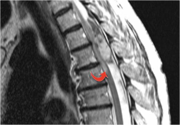 Các tổn thương MS hoạt động ở tủy sống có thể ngấm thuốc, nhưng không phổ biến như các tổn thương hoạt động ở não.