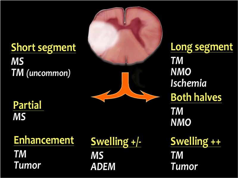 Ít gặp hơn là các bất thường lan tỏa, khi đó chúng ta có chẩn đoán phân biệt khó bao gồm viêm tủy cắt ngang (TM) và NMO.