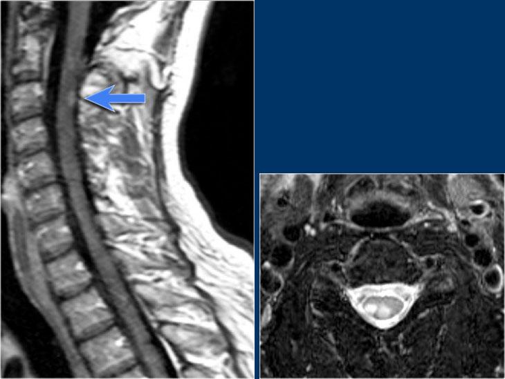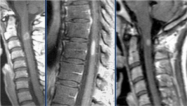 Trong những trường hợp như vậy, cần thực hiện hình ảnh cắt ngang cột sống để xác định vị trí chính xác của tổn thương và chụp MRI não.