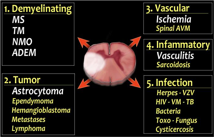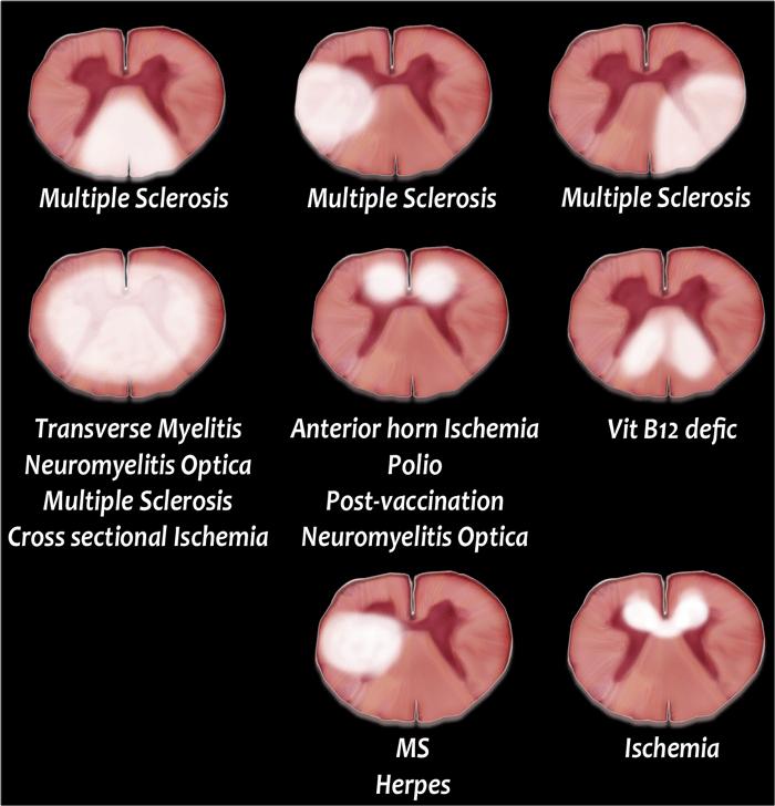 Nếu loại trừ bệnh lý tủy sống do chèn ép tủy như trong chấn thương, thoái hóa và bệnh di căn – vốn thường không gây khó khăn trong chẩn đoán – thì các bệnh lý tủy sống thường gặp nhất là các bệnh lý mất myelin.