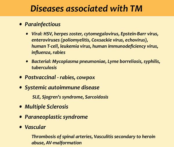 Viêm tủy cắt ngang có thể xảy ra đơn độc hoặc trong bối cảnh của một bệnh lý khác.