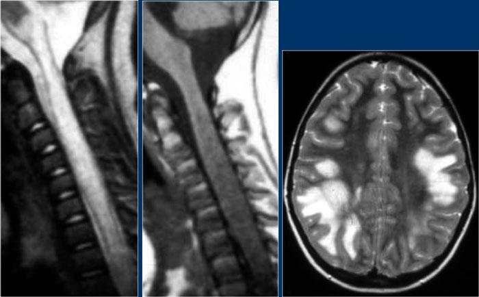 Các hình ảnh không đặc hiệu với nhiều tổn thương khu trú và chẩn đoán đầu tiên có thể nghĩ đến là xơ cứng rải rác (MS).