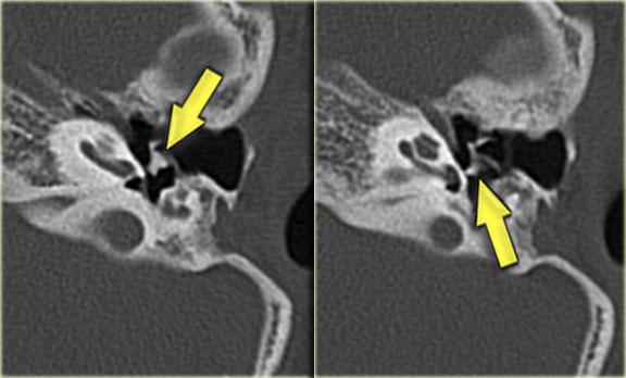Là một phát hiện tình cờ, có hình ảnh ống bán khuyên ngoài phình to (mũi tên vàng) và vắng mặt ống bán khuyên trên (mũi tên xanh dương).