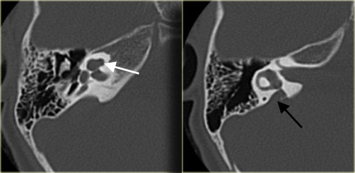 Cống tiền đình giãn rộng hai bên (mũi tên đen). Trụ ốc tai xương không quan sát thấy (mũi tên trắng).
