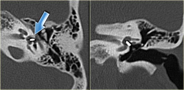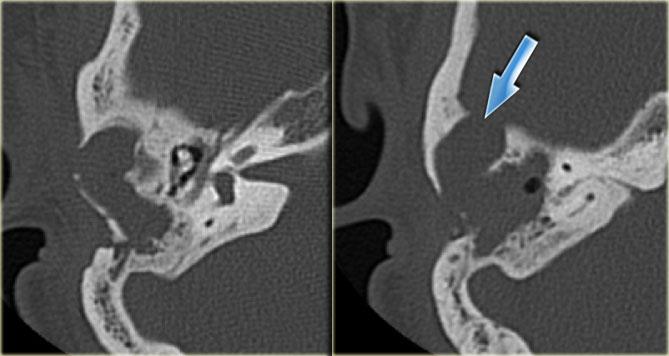 Bên trái là hình ảnh của một bệnh nhân có cống tiền đình giãn rộng hai bên.