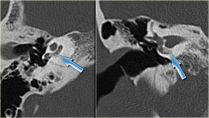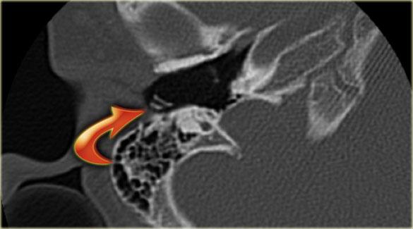 Lưu ý vùng giảm tỷ trọng nhỏ tại fissula ante fenestram, dấu hiệu của xơ cứng tai (mũi tên).