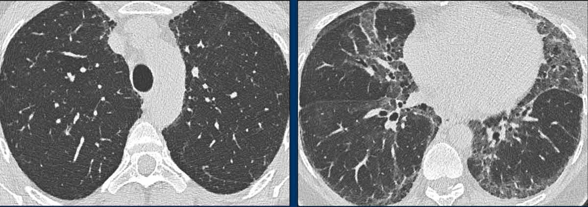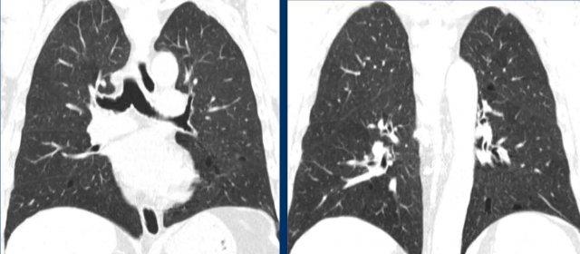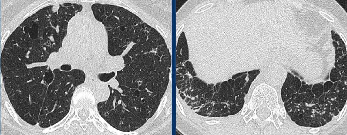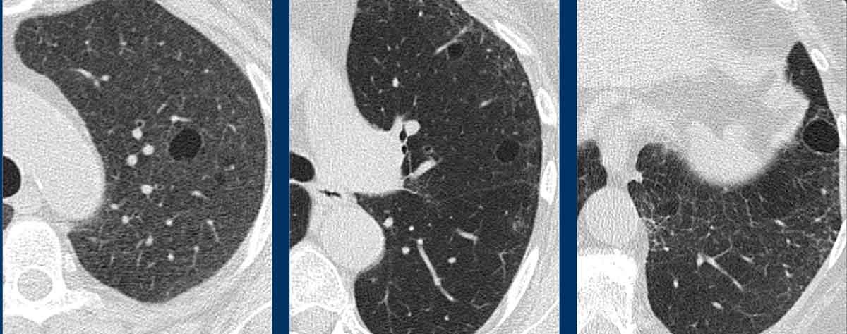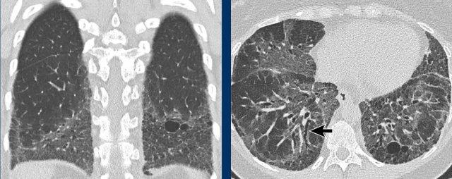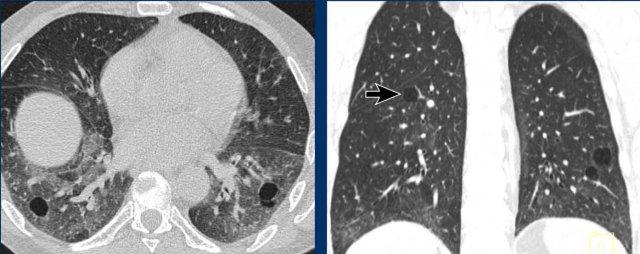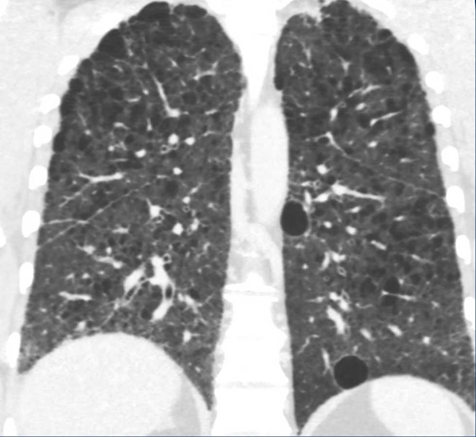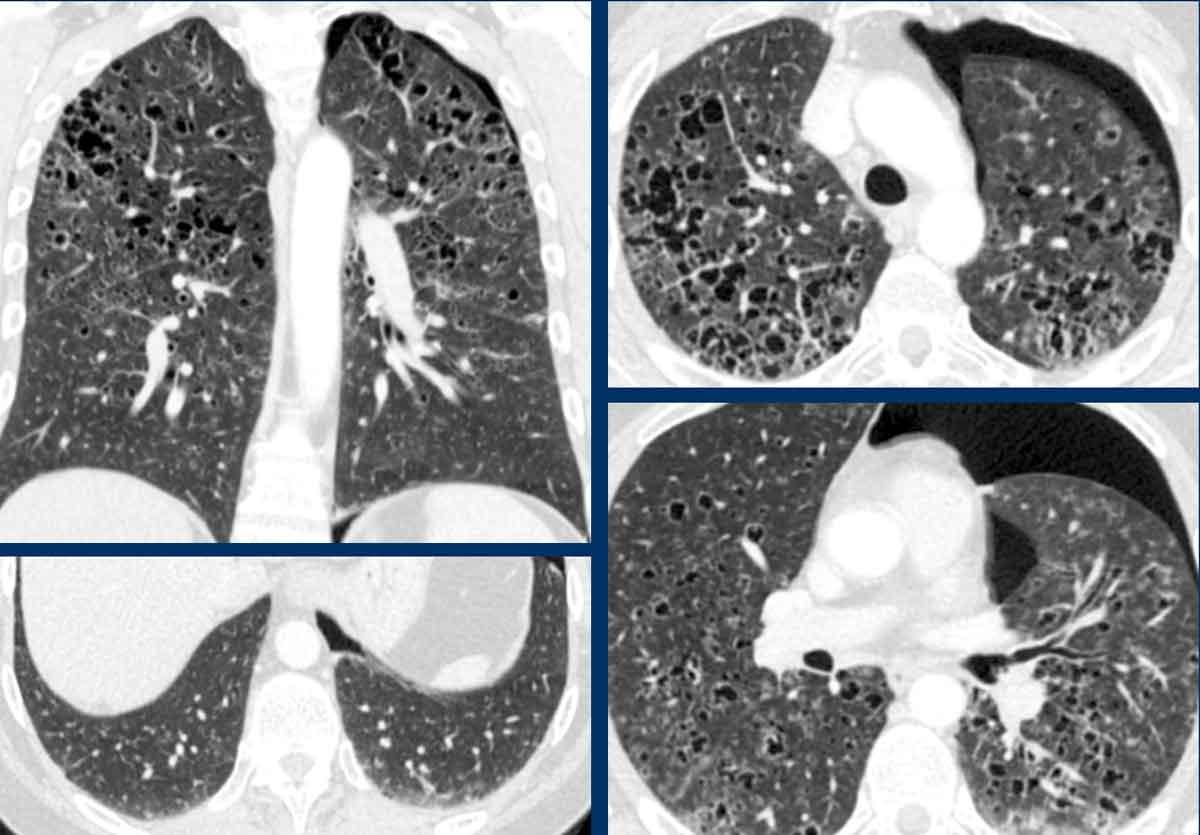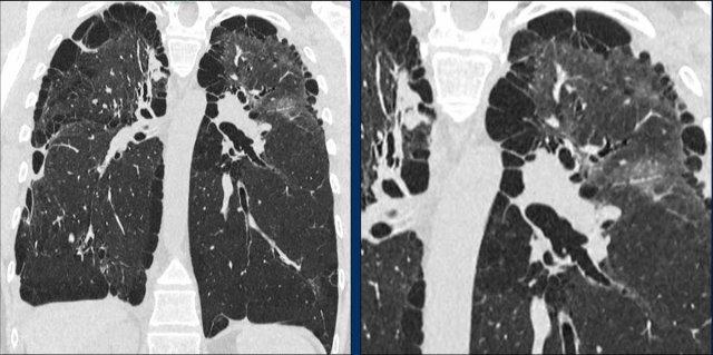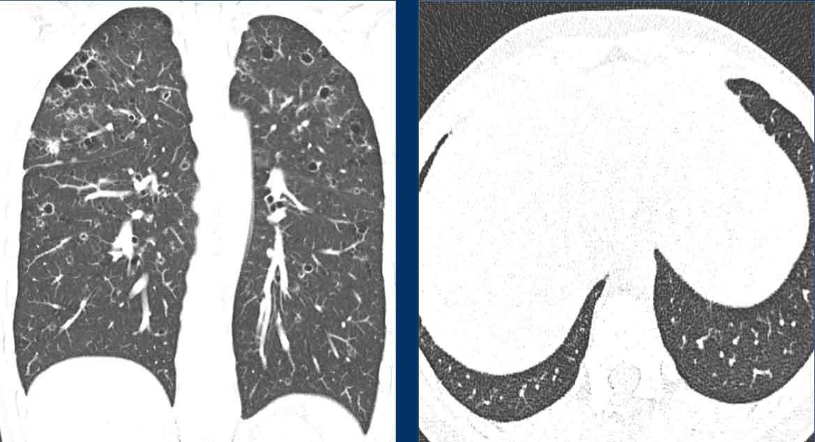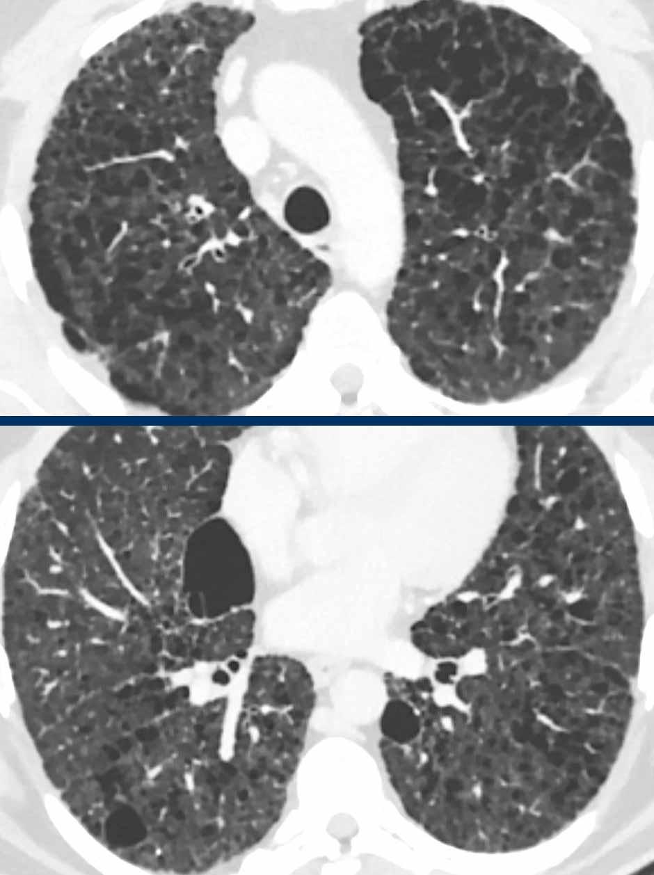 Bệnh nhân của chúng tôi chủ yếu biểu hiện bệnh dạng nang, với một lượng nhỏ kính mờ và chưa có dấu hiệu xơ hóa rõ ràng cho đến thời điểm hiện tại.