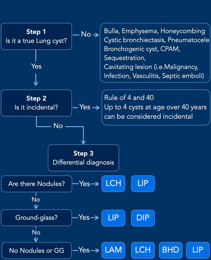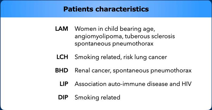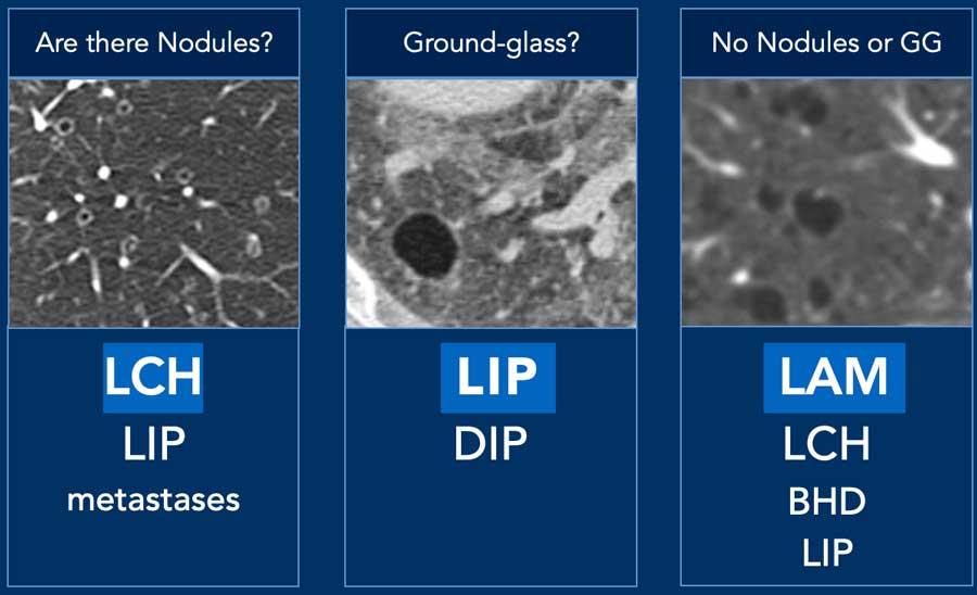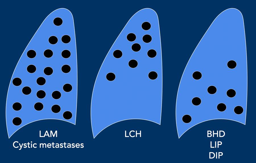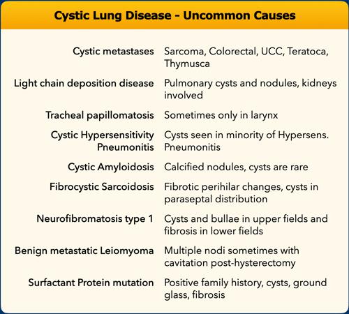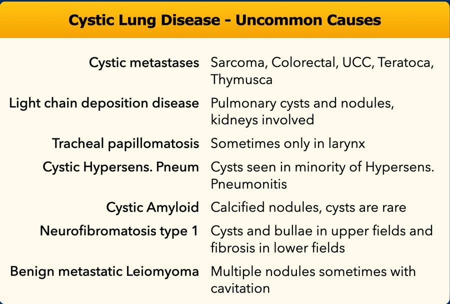 Khi các nang không phù hợp với chẩn đoán của các nguyên nhân thường gặp (LAM, BHD, LCH, LIP), hãy nghĩ đến các nguyên nhân không thường gặp của bệnh phổi dạng nang.