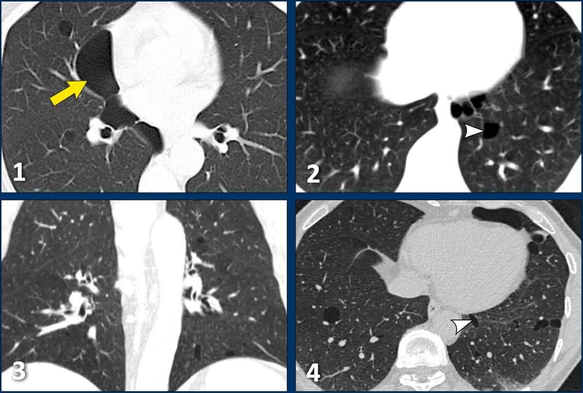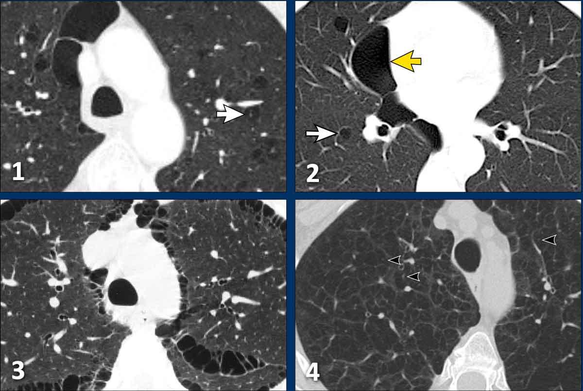 - Giãn phế quản dạng nang, biểu hiện là các ống dạng nang. Thường không khó phân biệt khi cuộn qua các lát cắt, nhưng đôi khi có thể gây thách thức.