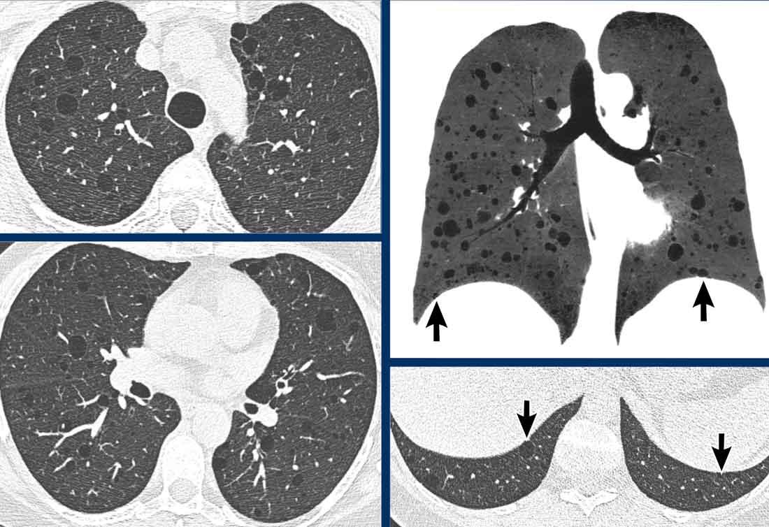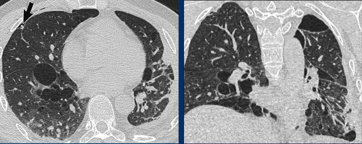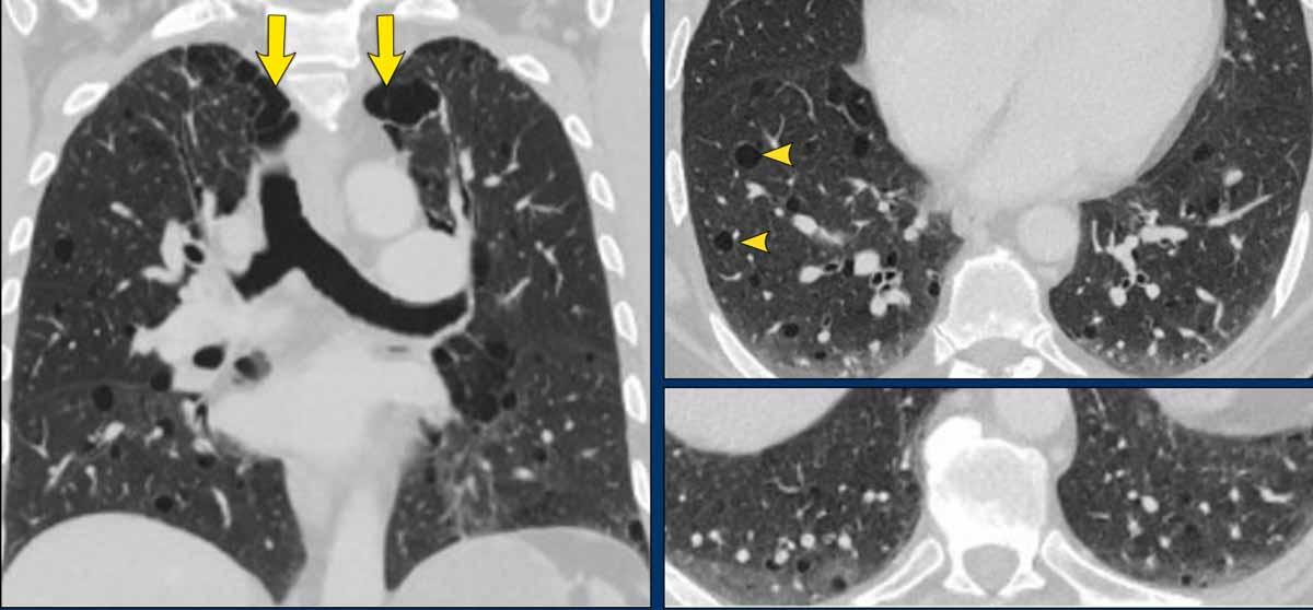 Đây là một nam bệnh nhân 59 tuổi mắc bệnh u xơ thần kinh type 1 (NF1). Mặc dù không hút thuốc lá, bệnh nhân có các thay đổi dạng khí thũng cạnh vách ngăn với các bóng khí (bullae) ở vùng phổi trên (mũi tên).