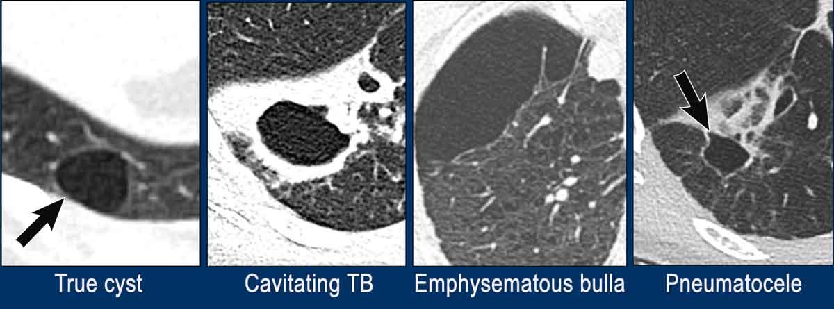 Trong phần tiếp theo, chúng ta sẽ thảo luận về cách phân biệt nang với hang, khí phế thũng, phế nang khí (pneumatocele), v.v.