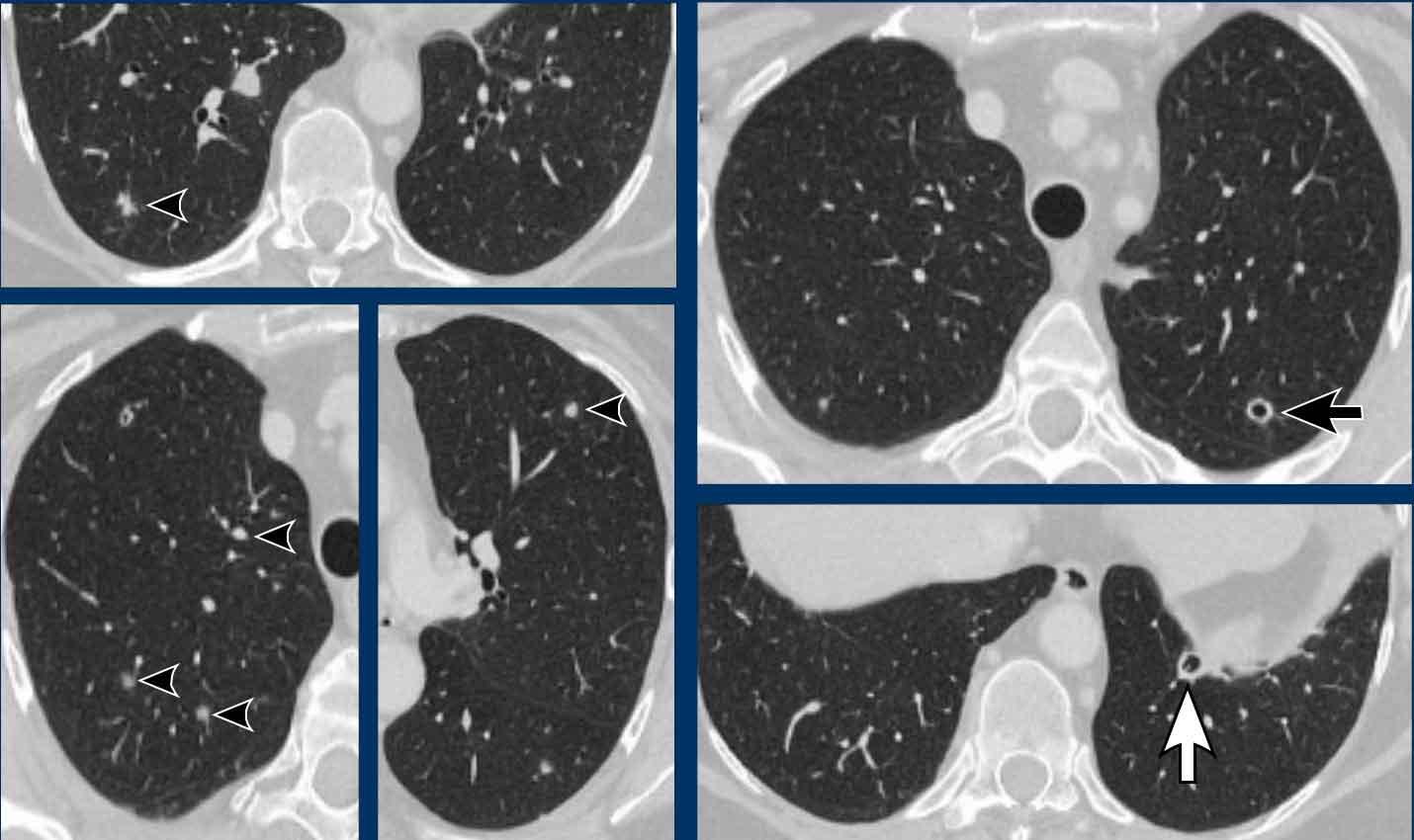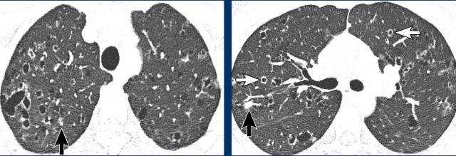Nhiều nang nhỏ hơn rải rác khắp nhu mô phổi (đầu mũi tên), bao gồm cả các ngách màng phổi.