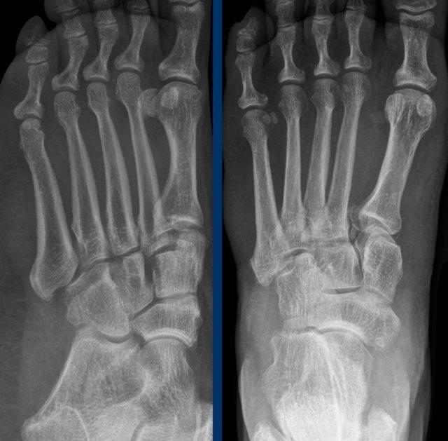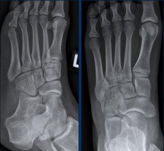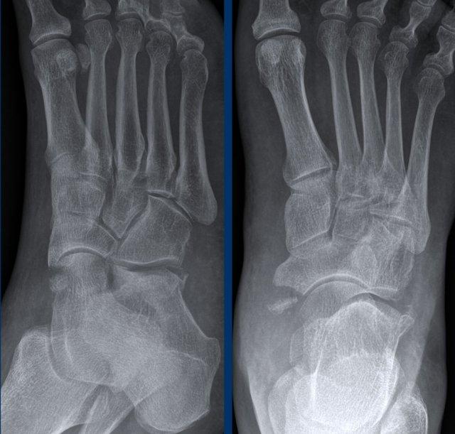 Bệnh nhân 33 tuổi bị chấn thương bàn chân và sưng nề vùng giữa bàn chân.