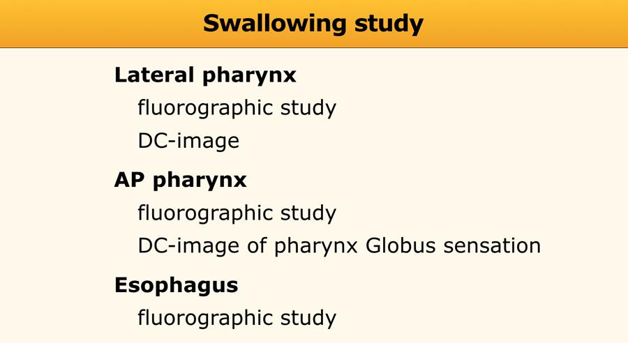 Bắt đầu bằng một hoặc hai lần nuốt ở tư thế nghiêng (lateral), tiếp theo là hình ảnh đối quang kép tư thế nghiêng của hầu họng (xem phần sau).