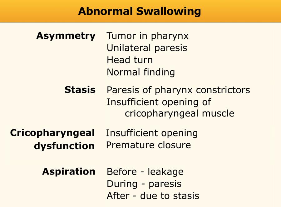 Ví dụ, sự đóng sớm của cơ nhẫn hầu có thể dẫn đến ứ đọng thuốc cản quang trong hầu họng, từ đó có thể gây hít sặc khi thanh quản mở ra vào cuối quá trình nuốt.