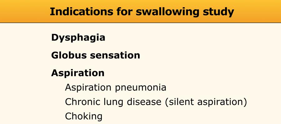 Các chỉ định thực hiện nghiên cứu nuốt bao gồm: khó nuốt, cảm giác vướng họng và hít sặc.