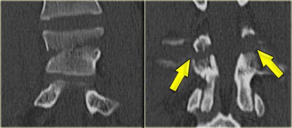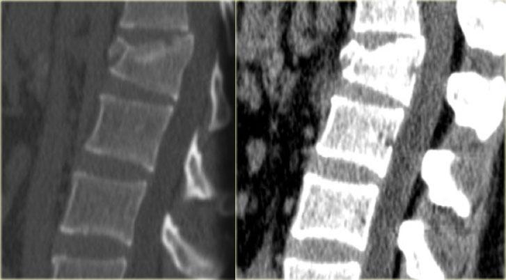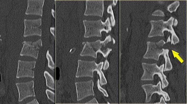 Các tái tạo mặt phẳng đứng dọc trên CT cho thấy phần sau thân đốt sống có chiều cao bình thường, nhưng có một phần tổn thương ở phía sau thân đốt sống.