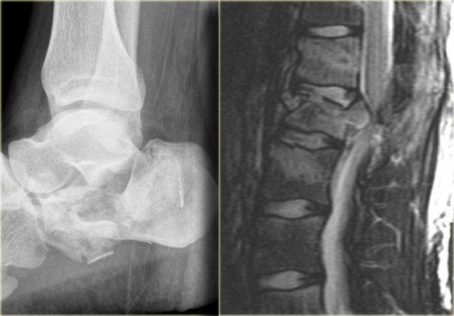 Bên trái là hình ảnh gãy xương gót và gãy cột sống thắt lưng.