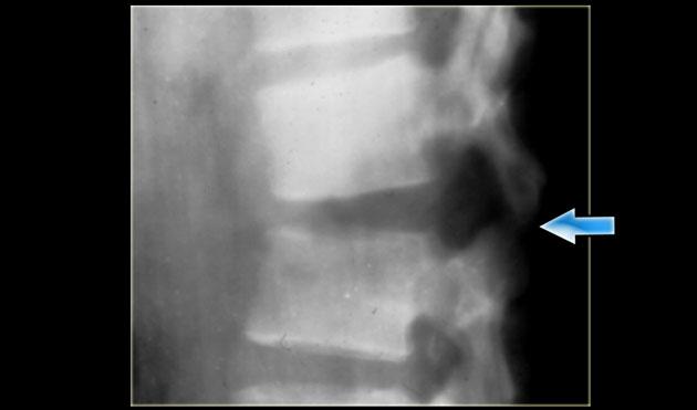 Trên phim X-quang cho thấy tổn thương tăng gấp khúc của L1 với sự tổn thương cột trước và có thể tổn thương cột giữa.