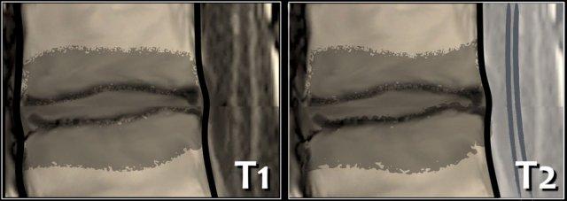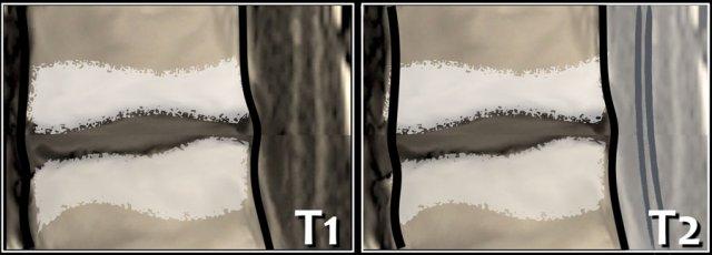 Modic Loại 1 biểu hiện giảm tín hiệu trên chuỗi xung T1W và tăng tín hiệu trên chuỗi xung T2W, phản ánh sự hiện diện của mô xơ mạch, các thay đổi viêm và có thể kèm theo phù nề.